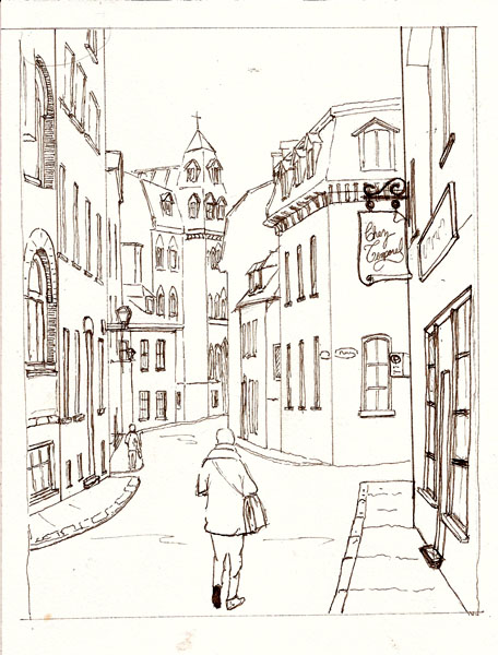 But I was out walking through a light mist, trying to get some exercise when it stopped raining. I bought my raincoat extra large so that I could wear it over my art bag, so I had that with me. The concept of sketcher desperation may be foreign to people who live in places with reasonable weather but for me, an ex-Arizona guy living in a place that stretches the truth by saying that we have five months of decent weather, it’s a very real concept.
