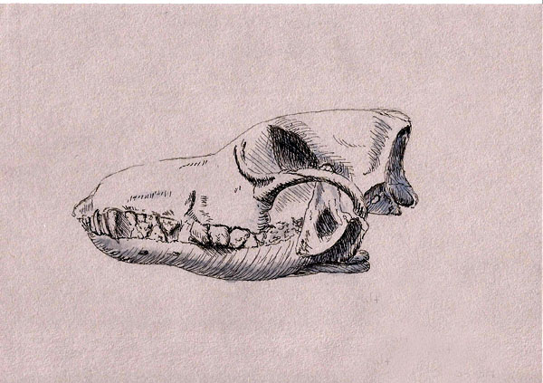 I decided to compliment this drawing with one of a wolf skull. If you extend the back of the skull in the drawing just a bit, you’ll see a pretty decent rendition of a wolf skull. Fun thing about this is that while I was drawing I kept thinking I was drawing everything too long, when in fact, I’d drawn the back of the skull too short. Better luck next time.