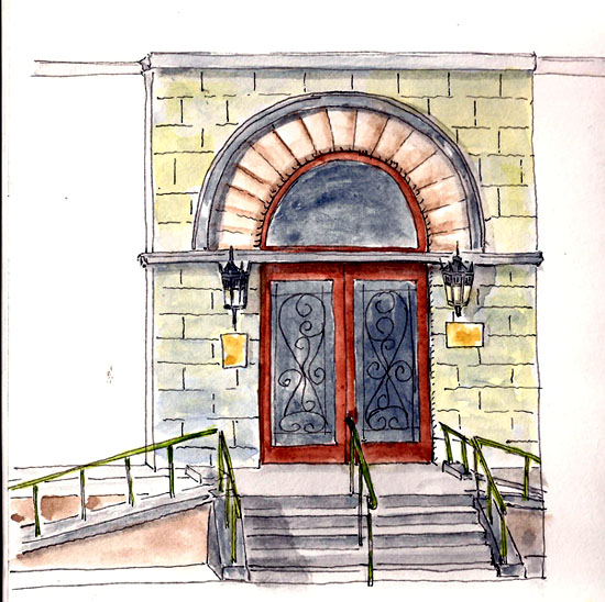 But I did get out one damp, cool day. It was only 7C with on/off misty rain but I was out walking and decided to do a quick drawing just to say I did. Here’s one of the side entrances to our city hall building. I hope things get on track soon so I can get out and do some real sketching.
