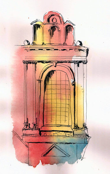 More recently I’ve started thinking about shading and such but still, I often envy those who are far more loose with their color interpretations. I don’t really know how far I want to move in that direction but the other night I was watching baseball and I’d drawn a facade from my imagination in a cheap toned sketchbook. While the paper was not good for watercolors, I decided to play a bit so I sat on the couch, legs curled up Kelly Ann Conway style, and I started adding colors. I couldn’t work wet in wet as the paper wouldn’t allow it but this is what I came up with. I liked it.