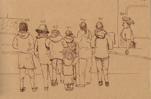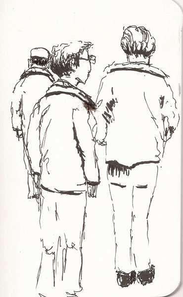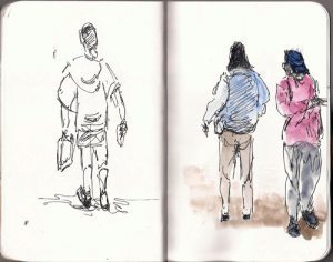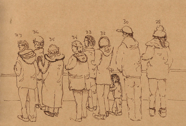 I knew that to draw 100 people in a week I’d have to concentrate on quick-sketching them. I also knew that I had a problem because I’d already committed to a sketching session on Tuesday that would have me spend the day away from people so I had to accomplish this task in four days rather than five.