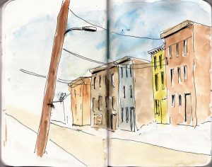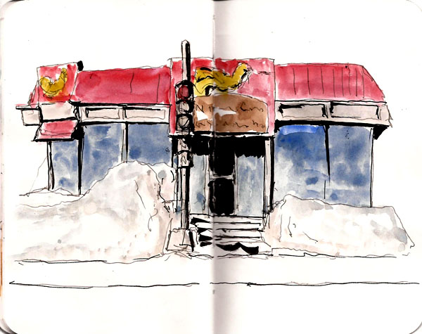 I also wanted more time quick-sketching. I do a lot of quick people sketches but I don’t quick-sketch buildings or street scenes. To get a good drawing I have to look at my subject for the better part of five minutes, thinking only about the proportions and relative locations of things before I start drawing. All of those processes must be abandoned if I’m going to do the entire sketch in five minutes. I do think I improved upon this because of this exercise, but I’m not sure how much. I also haven’t figured out how to draw snow with a pen and so I ended up with lots of cottonballs in front of my buildings.