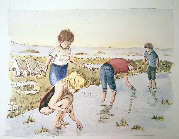 But I persisted, doing things for the first time at every turn. Still, the sketch started to look suspiciously like kids in tide pools so I convinced myself it wouldn’t be that bad. Eventually, as a last step, I did get out a fountain pen and added some lines and details, though I kept things a bit vague. I learned a lot, including how much I need to learn about watercolors. While it was frustrating at times, it was also a lot of fun. Maybe I’ll figure out fuzzy sticks eventually.
