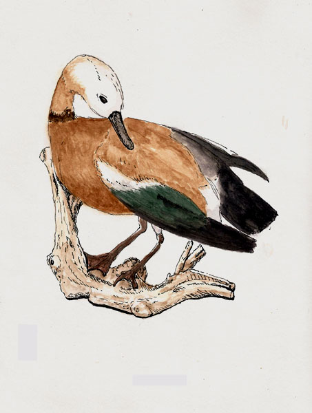 I was struck by this duck because I had never seen one before and I didn’t know what it was. There was no label on it. I drew it because of its atypical orientation but it wasn’t until I got home and talked with Mr. Google that I found out that this is a a Eurasian duck called the Ruddy Shelduck and that it’s very common in India.