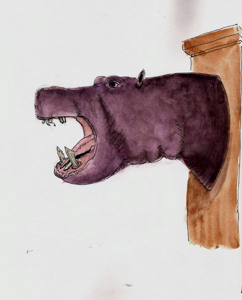 When we finished up in this part of the museum we decided to go upstairs to draw. The stairwell is filled with a bunch of stuffed animals. It was a very overcast/rainy day and this part of the museum was pretty dark but I decided to draw the head of a hippopotamus. As I sat on the steps, I could see the outline well enough but there was considerable guesswork regarding the various undulations on the body of the animal. It was both frustrating and fun to try to think about how the muscles would run around the head/neck of the animal.