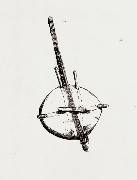 I was fascinated by this very primitive stringed instrument, formed by a drum-like body with sticks strung through it to raise up the “drum” cover so that a bridge could rest on it to hold the strings. The neck of the instrument was a long, somewhat rough stick with frets formed by ropes wrapped around it along its length. I hope I’ve captured it well enough to show these features.
