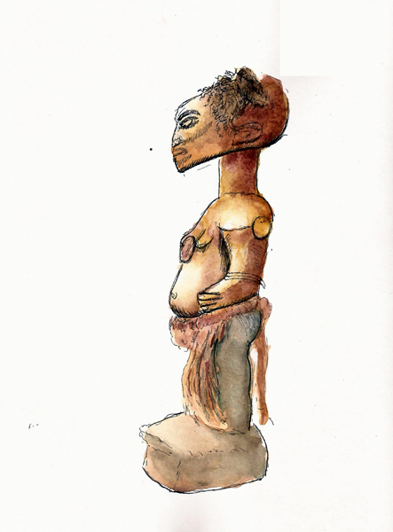I was getting sort of tired at this point but just to the right of where I was sitting was this clay statue that had a grass skirt and a bunch of feathers on its head. I quickly sketched it but didn’t completely finish it as time ran out. I played with some color when I got home but I don’t think it improved it much, if at all.