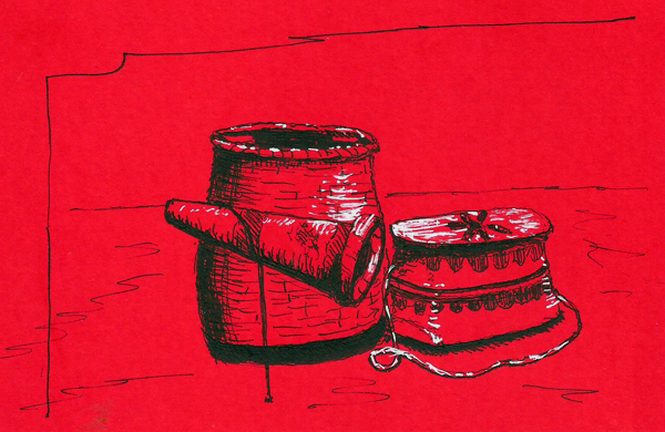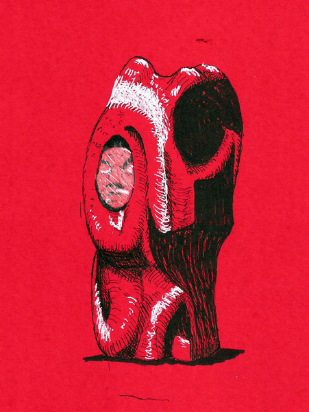 I was in the art student coop here and found some light card/cover stock in red and I bought a couple sheets of it. I wasn’t sure it would handle fountain pen ink but at $0.39 for an 11×17 sheet of the stuff I thought I could take a chance. As it turned out, it’s really nice to draw on as I found out the next day when I went to our museum. Here are those results.
