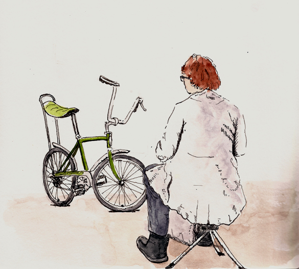Our group went there yesterday and we had a great time. There were six of us, which was just about right for this small single-room museum. Guylaine sat down to draw a Schwinn Stingray bicycle. It’s classic banana seat and high-rise handlebars brought back lots of great memories. I decided that rather than drawing a bicycle alone, it would be fun to draw Guylaine drawing the bicycle. Here is my attempt at that.