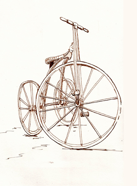 I find wooden bicycles to be quite marvelous. The museum had quite a number of them, but I decided to draw this very large (front wheel is 29″dia) tricycle. The amazing thing is that aside from the wheel bearings, rear axle, and pedal crank, the only metal in the bike is a y-shaped yoke that connects the body frame of the bike to the fork/handlebars.
