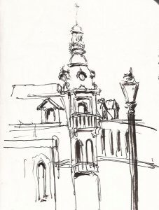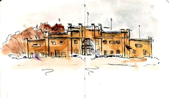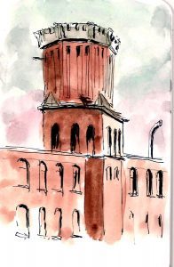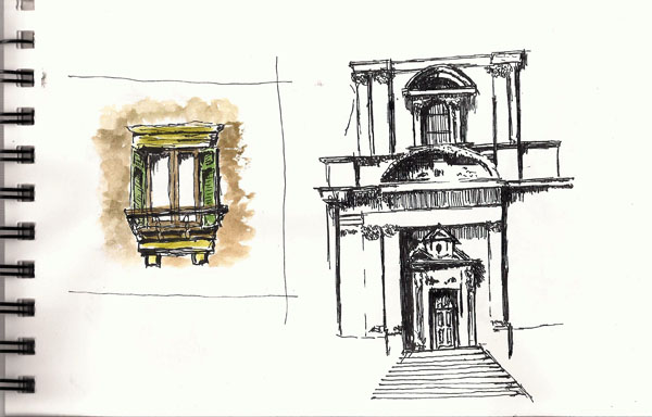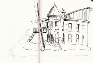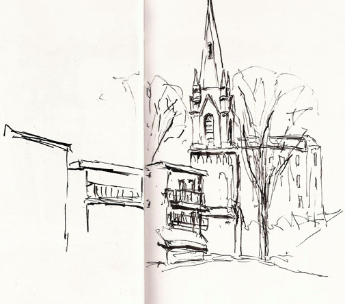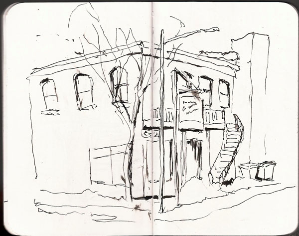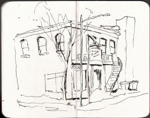 So far I’ve done 20 of these little scribbles. When it’s not too cold, it’s even starting to be fun. I’m beginning to think that by the time I get the 100th sketch done I may have made progress on all three of my goals. In any case I’m getting to do some outdoor sketching and that’s a good thing. Here are the last couple drawings I’ve done. I think I’ve moved from doing horrible sketches to doing bad sketches. I consider that a win. I’ve quickly added quick bits of color to these to see how they’d look with color. Extreme urban sketching is challenging but fun.