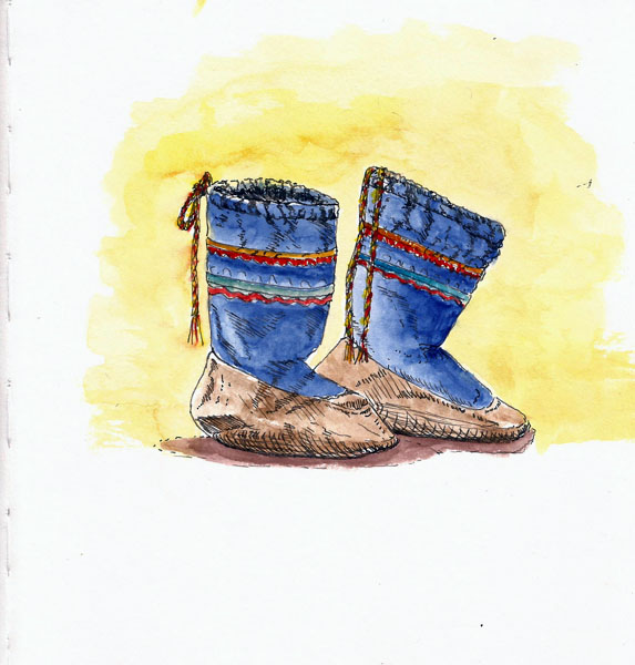 Due to lots of snow removal, going to sketchrawls, and general winter sloth, I am once again behind in my blogging. This sketch was done at the Musee de la Civilisation last Tuesday, I think. I like it a lot, mostly because I really enjoyed getting caught up in the detail of these beautiful boots. I hope you agree. I also hope I can get caught up ‘real soon’, like that’s gonna happen (grin).