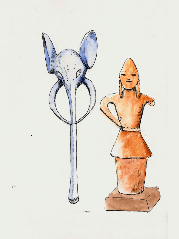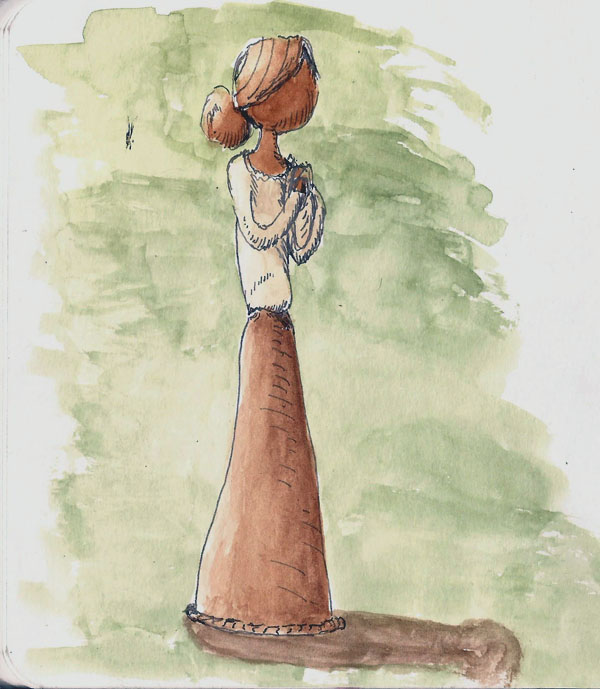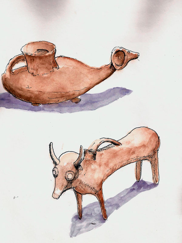 The exhibit is on two floors and I probably should have made a quick run around to inventory things but I just started sketching these small clay figures. They were simple, crude, and I managed to make them even more so when I went out in hall and tried to paint them while standing. I was at least a couple of hands short for that exercise.