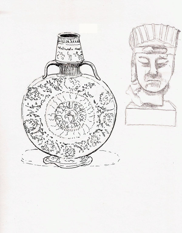 We only had 20 minutes left so we went back in and I decided to take that time to read about some of the smaller pieces which were at the other end of the first-floor room from where I had done my first page. That’s when I saw it… a large door into yet another room. Dare I say this was where thek really good stuff was? Large buddah’s statues of all sorts, large busts of Asian characters. Wow…and me with only a few minutes left before we were to rendevous for lunch and show-n-tell. I quickly drew one of the heads, using pencil this time. Yet another skill I need to work on.