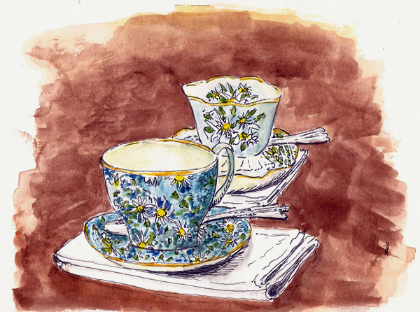 Then I sat down to draw a set of teacups set out as a still life. We broke for lunch and then, with belly full, I returned to sketching tea cups, spoons and napkins. My intent was to simply do a shaded contour drawing but somehow I got dragged down the rabbit hole of drawing all the decorations on the cups. This was a lot of fun and not nearly as hard as one would suppose. I hope you like it. Thanks to Hubert for hosting us.