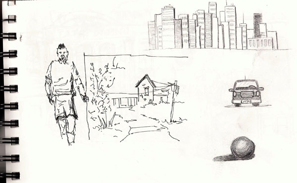 I’ll draw parts of other people’s sketches, trying to get a feel for how they’ve made the lines they’ve drawn. I’ll quickly sketch stuff, mostly from commercials on TV. I’ll draw lines and divide them into thirds, fourths and fifths, followed up by measuring how good I was at it and correcting the errors. I’ve filled a bunch of cheap sketchbooks with this stuff and it’s rare that any of it sees the light of day, but it’s the most important “art” I produce. Now that I’m thinking about it, I should post some of those pages so you can see how disjointed, loose, and how little thought is given to producing “art” of any kind. It’s all about training my visual cortex to gather the right information and disseminate it onto the page. Hmm.. maybe I’ll do that.
