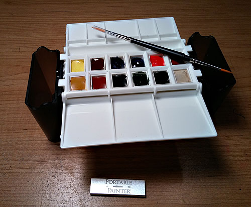 The opening photograph for this blog post was stolen from the Portable Painter website. I hope they don’t mind. It shows my new toy, but before I put paint into it. It also shows the 12 half-pans that come with the palette that makes it very quick and easy to get started using it.