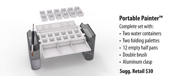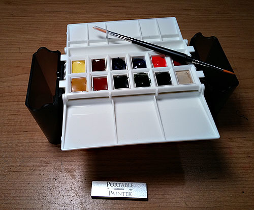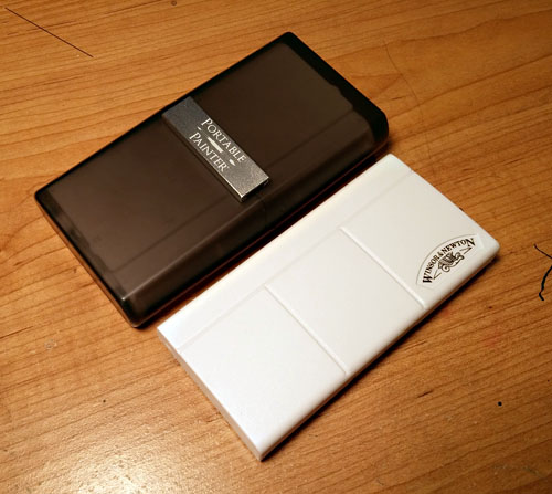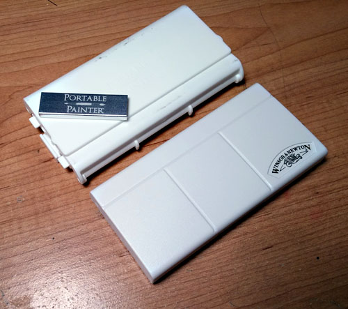 Those of you who use the Cotman Sketcher palette, and there are a lot of you, this is a major improvement because of the water reservoirs and larger mixing areas. This comes at almost no size or weight costs. Here are photos comparing the Cotman Sketcher to the Portable Painter, with and without the water containers attached.