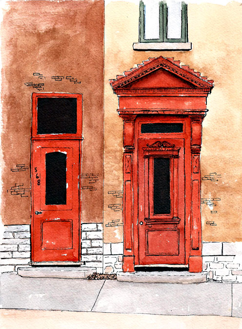 I love the doors of Quebec. I’ve often thought that an entire sketchbook filled with doors and windows of Quebec City would be great. If were even a little bit organized in my approach to sketching, I might just do one. For today, though, here’s a single door, well actually two of them, done from a photo (my photo) on 7.5×11 Fabriano Artistico cold press. I love this paper but it’s a bit rough for my very fine fountain pens.