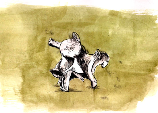 Eventually, though, we got back to drawing. I was in the mood to be challenged by an odd shape and I saw several sketches of a deer vertebra in one of Yvan’s sketchbooks. I asked him about it, he presented it, and I tried to draw it. Yep.. I was challenged. There’s at least one major error and, I’m sure, a bunch of minor ones. But such things sharpen the eye and if you take time to compare the end result to the original, you can teach the brain a lot about how to see.