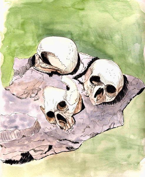 Ok…so I lied. Actually, I was at our Museum of Civilisation, in the nanotechnology exhibit. In that exhibit is a full-size model of the Terminator of movie fame in all its shiny metal glory and, of course, it’s posed over several broken skulls. In honor of John Connor I did my best to capture the remains of the 2029 urban landscape. I drew the skulls.