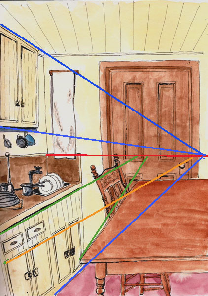 Notice that when I drew the doors on the lower cabinet (orange line) my brain had returned to the vanishing point and while these look the worst when it comes to alignment to the rest, they are actually more accurately drawn.