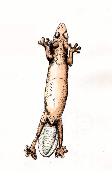 You see, the reason they’re in our nanotechnology exhibit is that they have nano-hairs on their feet. These are hairs so fine that they can cling to glass, those hairs ‘sticking’ to glass molecules using Vanderwaal forces, the forces that hold molecules together. And finally, today, one of these lizards was sticking to the glass out where I could see and draw him.