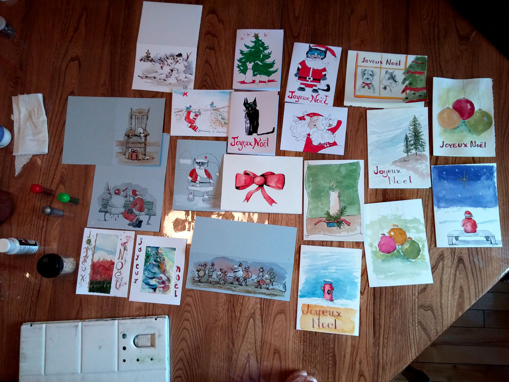 Lisette hosted the session which provided special treats. She does really nice watercolors and each room held at least one gem and her studio held a bunch of wonderful watercolors. And she made soup and homemade bread for lunch. Both were fantastic I admit that I stuffed myself. Then she brought out homemade carmel corn, muffins and Guylaine brought gingerbread cookies. Before lunch was over I was double-stuffed and I was only able to draw one more card during the afternoon session. Here’s a photo of most of the cards made that day, by the seven people in attendance.