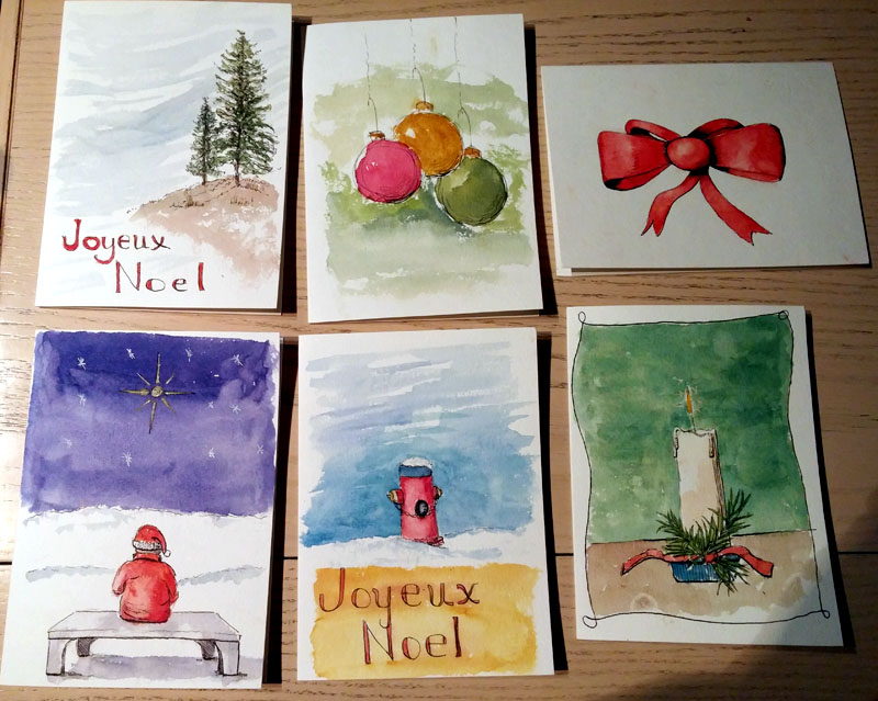 Every year I see a bunch of Christmas cards, drawn, scanned and posted by talented sketchers everywhere. I’ve never been so inclined, possibly because I’m not a fan of typical Christmas iconology. This year, however, people in our group wanted to do a card-making session so I made my first Christmas cards. The most common method was to look at pictures in books and reflect those ideas on the card. Because I’m trying to exercise my very, very limited imagination these days, I decided to just “make stuff up.” I can’t say the results were stellar but I sure had fun doing them. These were done on inexpensive watecolor paper cut and folded in half to the size of a typical card.