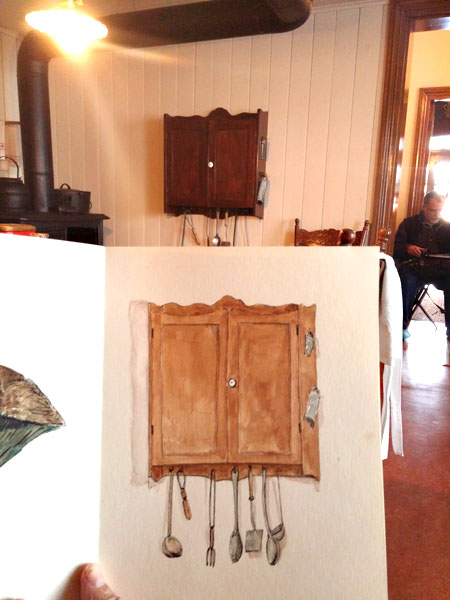 [image error]We went. We were there. We had fun. I drew a cabinet hanging on the kitchen wall, mostly because of all the goodies hanging from it. I shot this photo of sketch and cabinet as I waited for the first bit of paint to dry. Once dry, I added more color and this was the result. I mucked up the shadows but nobody’s perfect