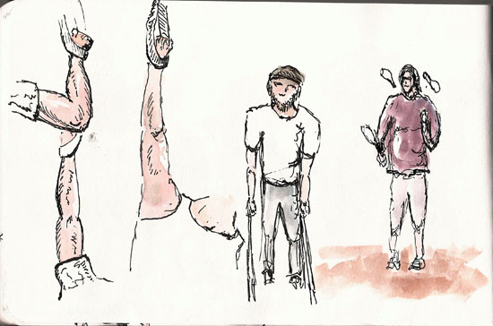 Somehow, during the page above I decided that a divide and conquer strategy was in order, or maybe I was just fascinated how the well-muscled athletes provided a great opportunity to do “life drawing” while muscles were being exercised. That turned out to be a lot of fun.