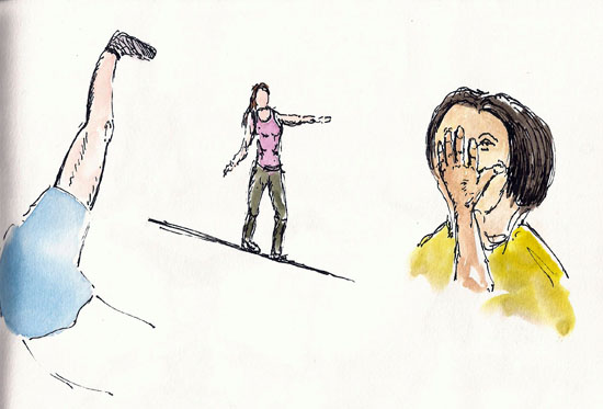 The other reason I have a hard time is that it’s just soooooo hard. I’m not good at sketching people anyway, but I can hold my own when sketching people who are sitting or standing and I even have a good chance at capturing people wandering around in a shopping center. In all these cases, though, I have points of reference. Feet on the ground, heads above feet… at least that. But in the case of circus performers I don’t even have that and I get very confused, very quickly.