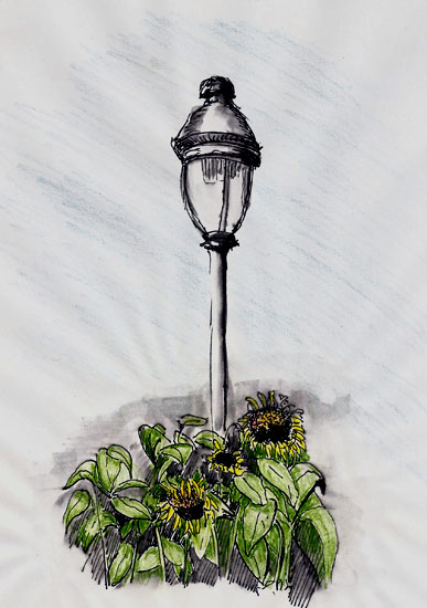 And so, this morning, I got up, grabbed a piece of photocopy paper (does this mean I haven’t completely bought into the idea?) and I did a quick drawing of a lamppost coming out of a pile of sunflowers that I saw on Ile d’Orleans this summer. I’m sure it’s not completely accurate but I think it’s close to the real thing. Most of all, I felt a process I’ve never felt before, a questioning of how big/small things were, how one thing related to another and I think this is the stuff Yvan was talking about.