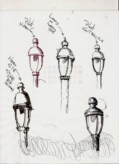 I sipped some coffee and thought some about what I’d just done, which in turned caused me to grab another sheet of photocopy paper and I started doing really quick sketches of the lamp using a bunch of different pens. No attempt was made to be accurate as mostly I was thinking about how each pen felt and what kind of line did it make. I include it here just to document this journey, not that it is anything worthy of looking at.