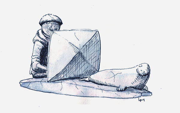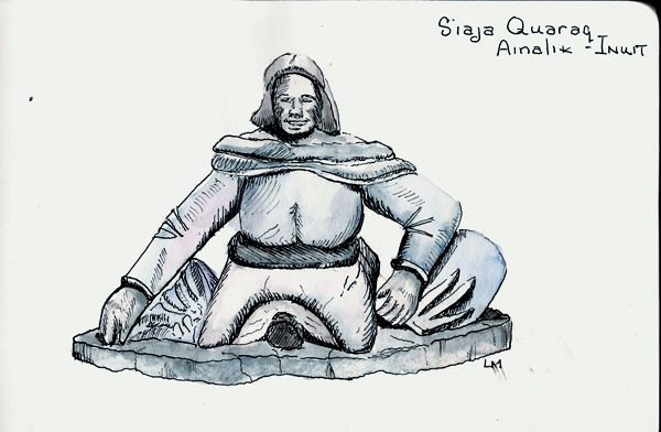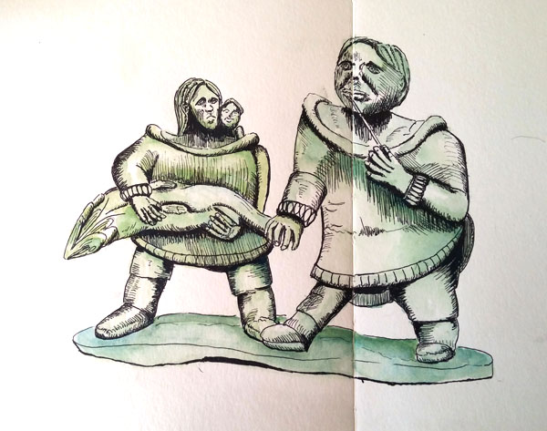 We returned to the museum of civilisation on Thursday and I continued sketching Inuit soapstone carvings. These are not precise carvings but they have a smoothness about their surfaces that is impressive when you realize they’re generally done by hand. More importantly, traditional Inuit carving is a form of story-telling, a reflection of Inuit life.