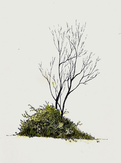 Anyways, my first sketch was a small, defoliated tree and I thought it only fitting that I should follow it up with a pine tree. As it turned out, I drew two of them, the second coming simply because I wanted to try to do a classic Christmas tree shape. Probably shouldn’t have cuz it looks out of place in this sketch, at least to me. One thing I’ve noticed about sketching at home, with good light, a desk and a good chair. The sketching is a whole lot easier.