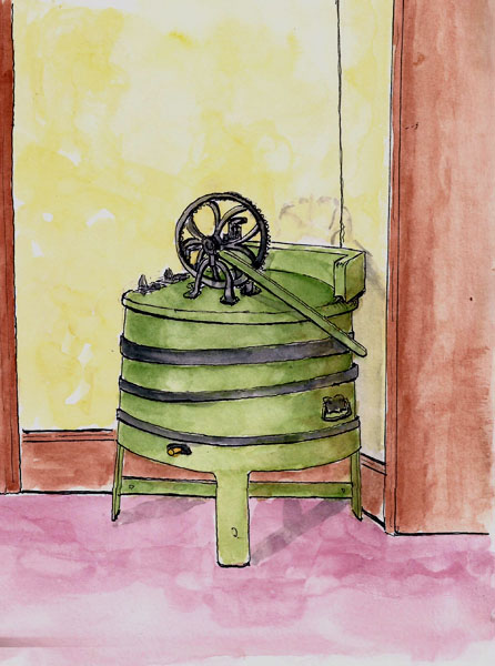 The house, though, is sketcher heaven if you like sketching items you’d find in a Victorian house. It’s a place I’ll be going to several times this winter for just that reason. But on this day I found myself in the kitchen and in one corner there was a wooden, hand-agitated washing machine. It had been semi-restored as a display piece but the staves that made the body of the machine had been glued together and the metal bands that would normally hold everything together were placed, somewhat askew, just for show.