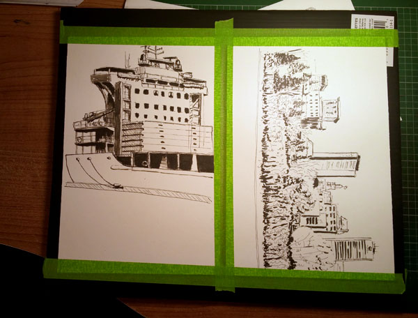 I decided to go armed with quick-draw (pun intended) materials so I took a couple of 10×14 Coroplast sheets, cut some 6×9 sheets of cheap multi-media paper, and I taped two sheets on each side of the coroplast. These were shoved into my bag and out the door I went. The idea was that I needed to do sketches quickly so I didn’t have to sit for a long period, which cause my old Arizona bones grow cold and I get grumpy.