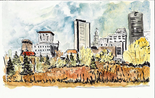 We are getting a reprieve from the relentless march into winter. We’ve had a couple days where the temps have gotten up to 6-7C (low 40s for the metric-challenged). It’s also been very windy but yesterday the winds dropped to a reasonable level and I just couldn’t pass up the possibility of doing some outdoor sketching.