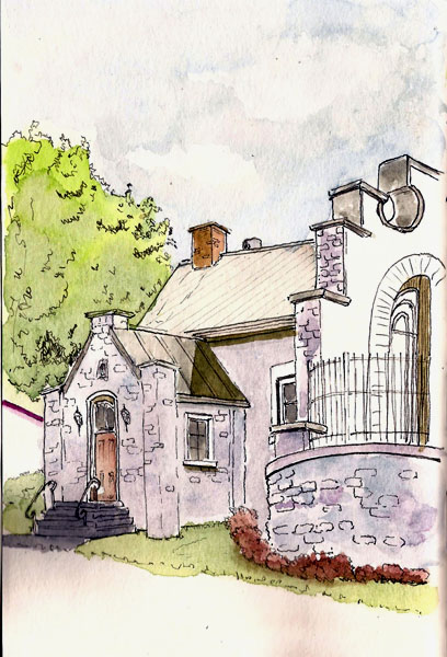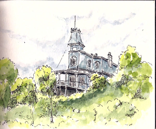 While Karen was doing her second sketch, I decided to draw a house that’s high on the hill overlooking the park we were in. I’ve drawn the house before but this new park provided a much better viewing angle.