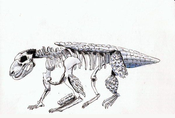 While waiting for our daughter to get out of work, Chantal indulged my passion by agreeing to wander around the nature museum while I sketched this guy. While Fred Flintstone’s pet looked like a baby brontosaurus, I suspect that cavemen might have been happier with this dog-like beast. The display only had the leg and back armor on one side, I drew it as it sat and thought it pretty cool.