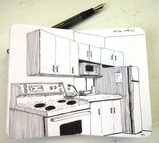 One evening I was sort of antsy about not having done any sketching so while the family was reading, I tried to channel Paul Heaston and drew my daughter’s kitchen. I’m afraid that Paul and I had a bad connection because I don’t have the hatching/drawing skills that Paul has but I had fun doing it and that’s all that matters.