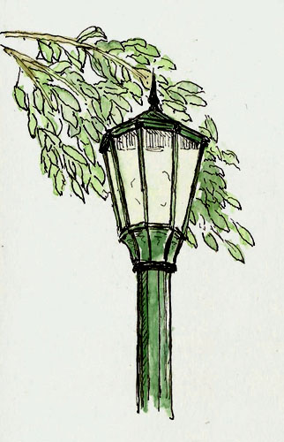 Both Karen and Alex drew Joan. I’d drawn her a couple times and decided this would be an opportunity to draw Karen instead. Because it was a simple drawing, I had time to do a small sketch of one of the lamp posts that surround the garden. Have I mentioned lately how much I love to draw lamp posts (grin)?