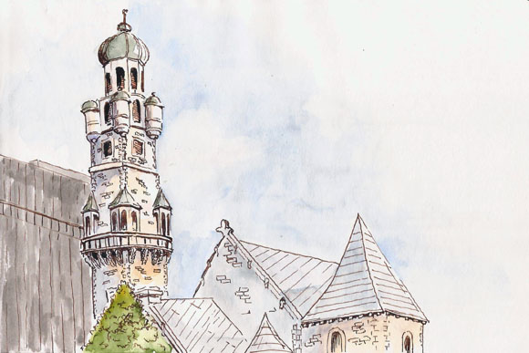 I suspect that Quebec City has more church towers per capita than most place on Earth so a sketcher has many to draw, but none of them comes close to the this amazing structure. It reminds me of structures that the Legos folks come up with when trying to show off the complexity they can produce with colored blocks This church is for sale, by the way, if you need a spacious art studio with some flare.