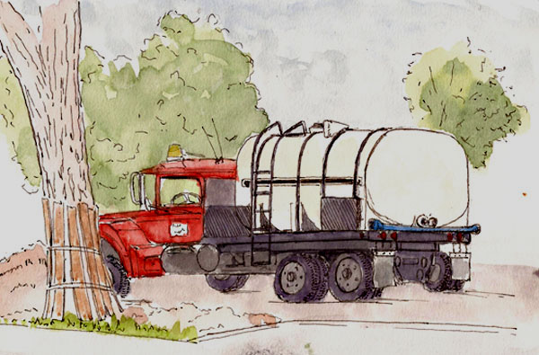 When the workers go home, however, they do leave their toys behind and so I sat on my front porch and drew this large water truck whose job is to spray down the street to keep the dust down. Not the most esthetically pleasing sketch but I had fun doing it.