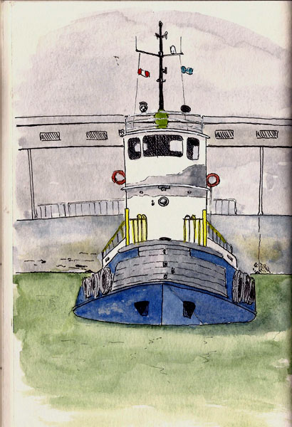 This is really odd because I’ve spent most of my life living in places like Phoenix, Arizona and there aren’t any tugboats in the Sonoran Desert. But there are tugboats in Quebec City and I love to draw them. They all live in a basin with an opening to the St. Lawrence where they push and pull large ships in and out of port. Here’s my latest effort.