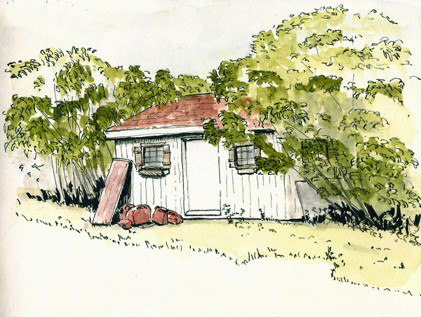 All of this is to say that I did a lot more talking than I would at most sketching sessions and so my sketching time suffered. Still, I found a place that was out of the crowds and I plunked myself down in front of this neglected potting shed and drew it.