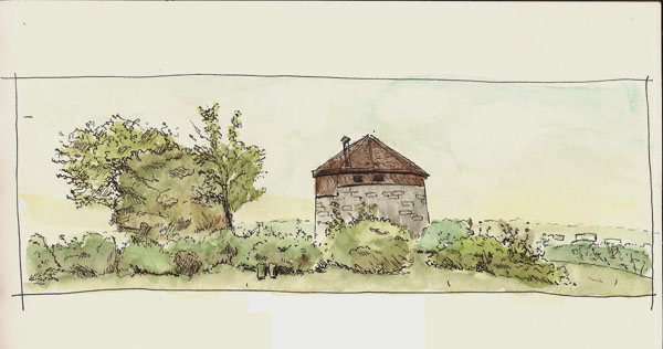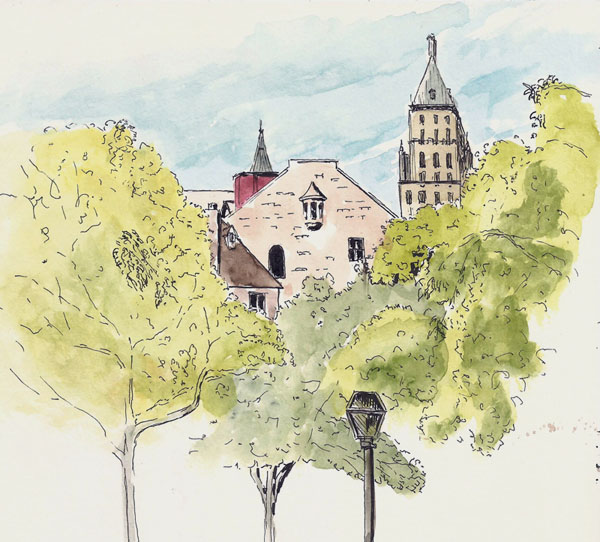 This is a view I’ve wanted to sketch for a while. It’s nothing special but the trees frame up a group of building shapes that has always attracted my eye.