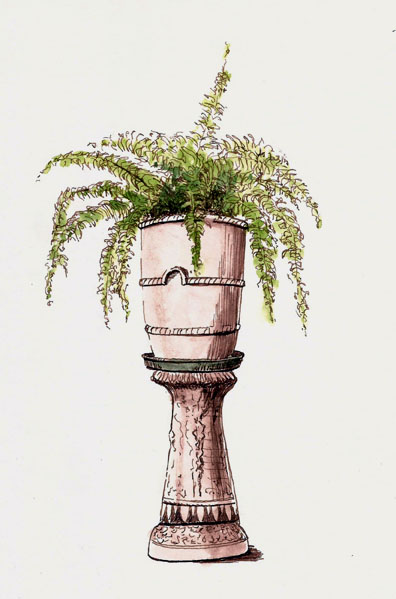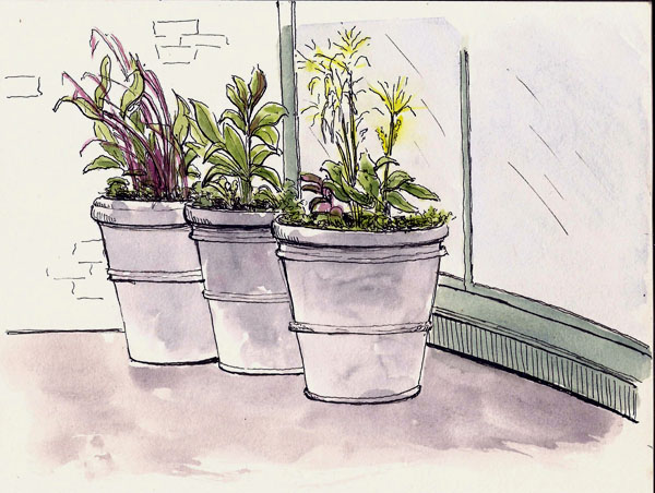 We can’t catch a break with the weather it seems but Yvan and I sat under an awning in open-air atrium at the museum and sketched very large potted plants. This area becomes a restaurant when weather permits and these huge pots will be moved around to decorate the area. I was struck by the fact that while these huge planters were very similar to one another, none of them were exactly alike.