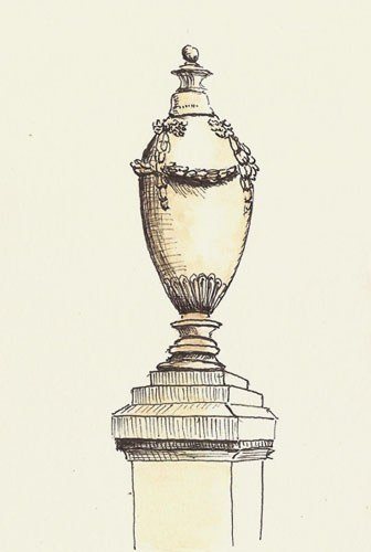 This was a blustery day, putting a chill in my bones as I walked along so I was reluctant to stop to sketch. I was looking for something I could sketch quickly, before the wind took its toll. There are a series of large stone sculptures that form a fence near the seminary. I hid from the wind behind a large statue and did this sketch as quickly as I could. Hope you like it.